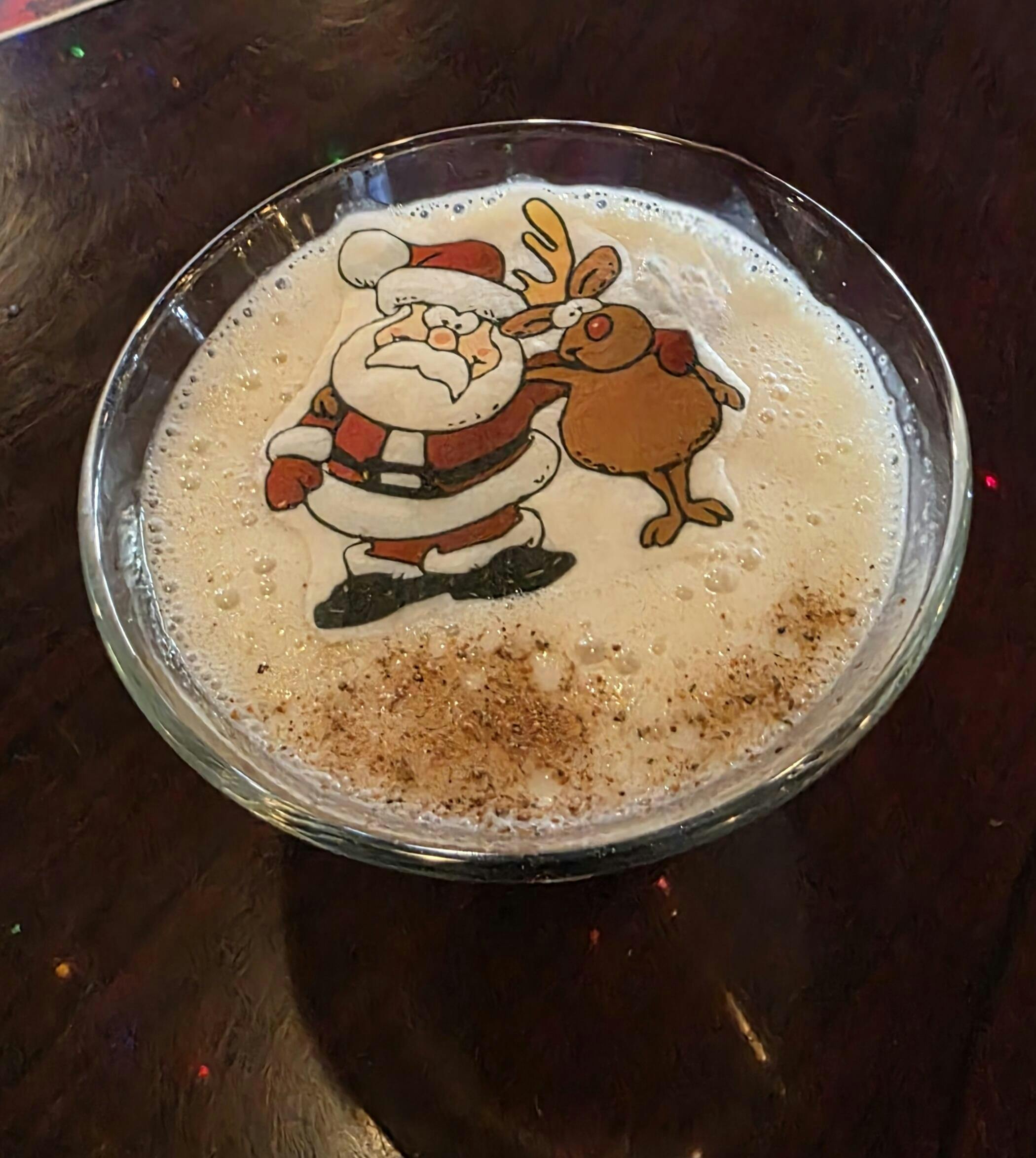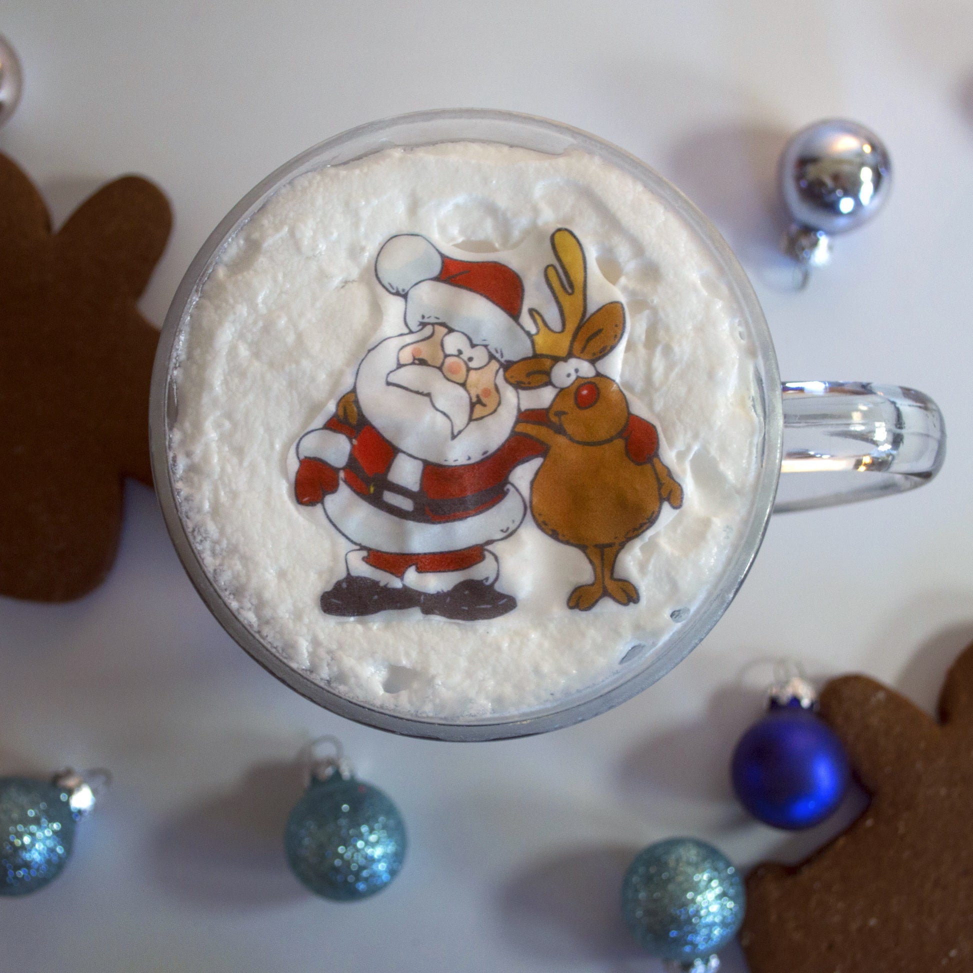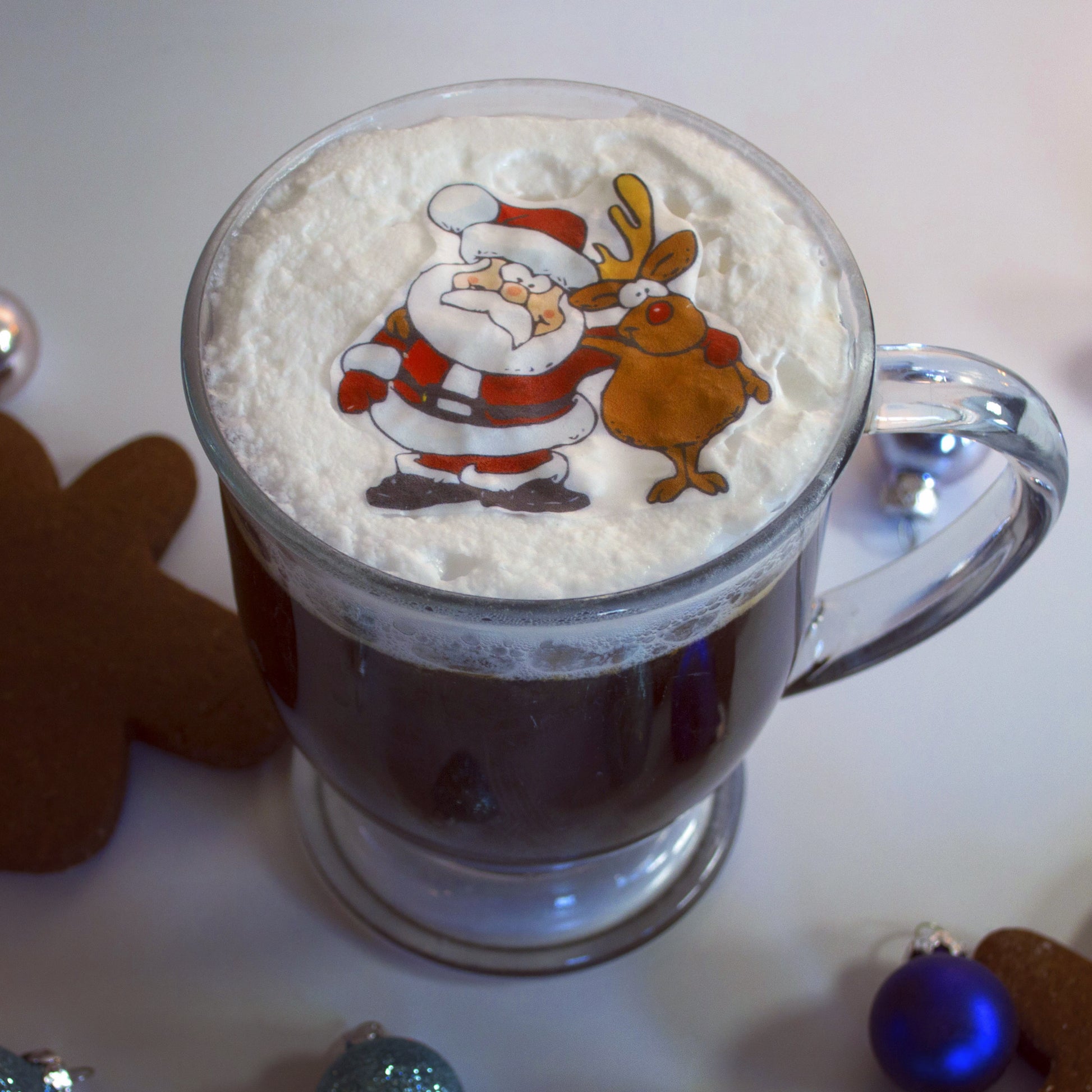 Cartoon Santa and Rudolph the Red Nose Reindeer wafer paper cocktail topper. lasts 1 year plus if kept dry and out of direct sunlight. Once placed on top of your favorite drink with foam, the image will last about 20 minutes. 5-10 minutes for non-foam drinks. Works great on desserts as well!