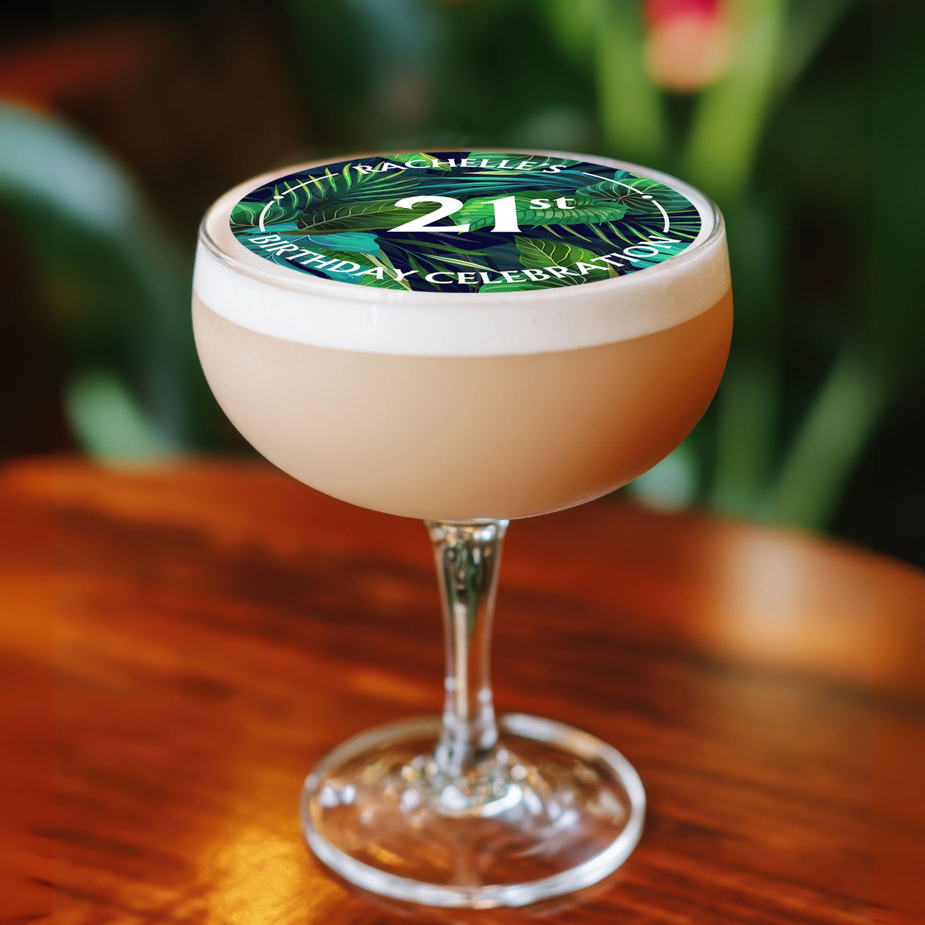 Special occasion drink toppers: Pack of 25. Bring the spirit of the islands to your celebration with custom edible drink toppers featuring your name and age in crisp white text over a lush background of exotic tropical leaves. Perfect for tiki bars, Hawaiian-themed events, pool parties, and beach birthdays, these toppers make every drink look like it belongs on vacation.